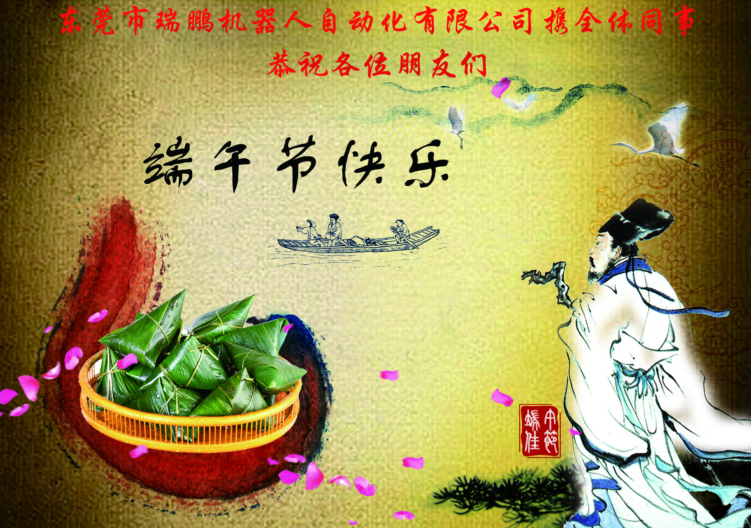 尊敬的各位瑞鵬機器人公司的新老客戶朋友們,您們好!初夏來臨,也預(yù)示著中華民族的傳統(tǒng)節(jié)日——端午節(jié)即將到來。在微風習(xí)習(xí)、龍舟浩蕩、粽米飄香的端午節(jié)里,東莞市瑞鵬機器人自動化有限公司攜全體同事,衷心祝您及您的家人身體健康,平安吉祥。